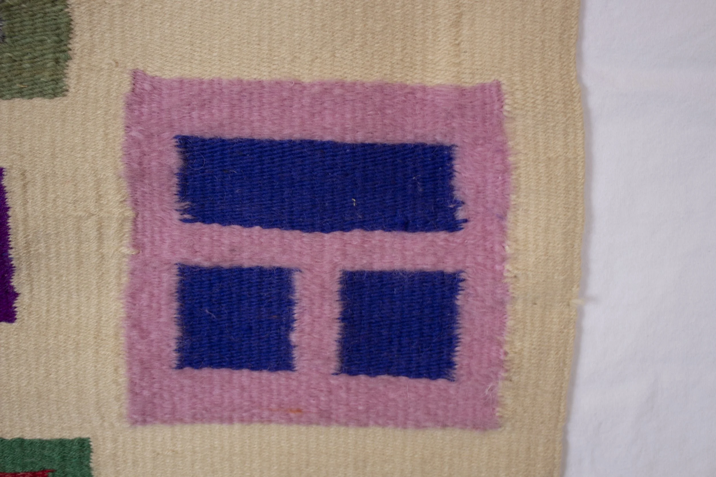 Done on my floor loom, this piece traveled to two states and three apartments before I was ready to pull it off the loom. I made a fully weft-facing rug using a traditional tapestry method of spacing out the warp strings. Often working with up to 7 or 8 weft strings at once, I freehanded all of the blocks on this rug, trying to create vibrant pops of color on the cream background.